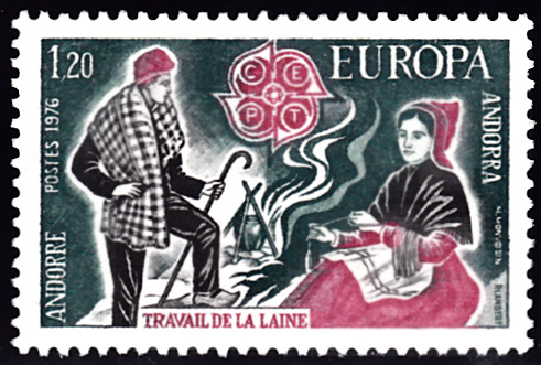 Die Europamarken 1976 zum Gemeinschaftsthema "Kunsthandwerk" erschienen bei der französischen Post in Andorra am 8. Mai 1976. Hier die Marke zu 1,20 F mit der Abbildung eines Schäfers, einer Feuerstelle und einer Wollspinnerin, die in einer Auflage von 500 000 Stück erschien.