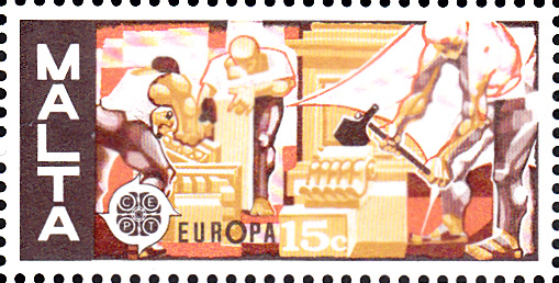 Die Europamarken 1976 zum Gemeinschaftsthema "Kunsthandwerk" erschienen auf Malta am 8. Juli 1976. Hier die Marke zu 15 Cent, die Bildhauer abbildet. Die Auflage betrug 982 452 Stück.