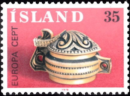 Die Europamarken 1976 zum Gemeinschaftsthema "Kunsthandwerk" erschienen in Island am 3. Mai 1976. Hier die Marke zu 35 Kronen mit einer Hölzernen Schüssel, die in einer Auflage von 1 000 000 Stück erschien.
