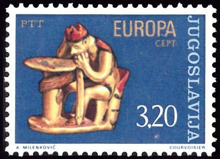 Die Europamarken 1976 zum Gemeinschaftsthema "Kunsthandwerk" erschienen in Jugoslawien am 26. April 1976. Hier die Marke zu 3,20 Dinar mit der Abbildung der Keramikskulptur "König Matjaž" von Jakob Podgorelec. Die Auflage der Marke betrug 1 072 356 Stück.