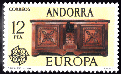 Die Europamarken 1976 zum Gemeinschaftsthema "Kunsthandwerk" erschienen bei der spanischen Post in Andorra am 3. Mai 1976. Hier die Marke zu 12 Pesetas mit einer geschnitzten Holztruhe, die in einer Auflage von 699 770 Stück erschien.
