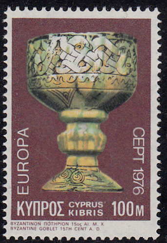 Auf Zypern erschienen die Europamarken 1976 zum Gemeinschaftsthema "Kunsthandwerk" am 3. Mai 1976. Hier die Marke zu 100 Mills mit dem Motiv "Byzantinischer Kelch (15. Jh.)", die in einer Auflage von 525 000 Stück erschien.