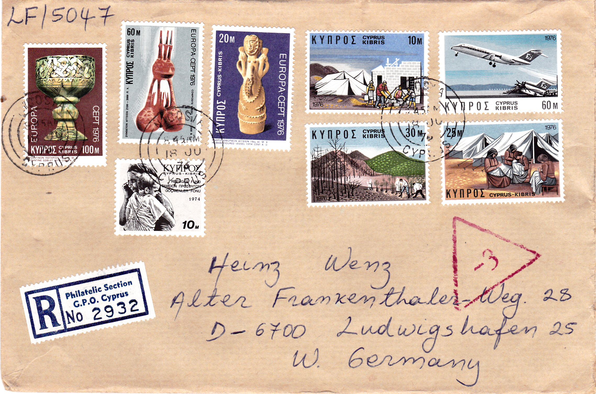 Kompletter Satz der Europamarken 1976 in einer Mischfrankatur mit anderen Marken und der Zwangszuschlagsmarke für die Flüchtlingshilfe auf einem Einschreibebrief vom 18.6.1975 von Nicosia nach Ludwigshafen. Da der Einschreibebrief am 24.6.76 benachrichtigt wurde, ist vorderseitig das Ende der Lagerfrist (3.7.1976) mit dem roten Dreieckstempel vermerkt worden