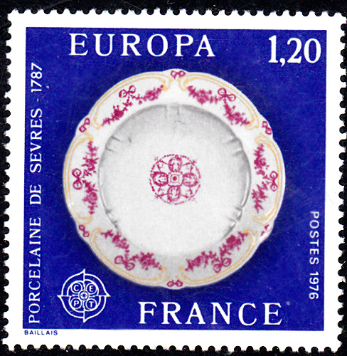 Die Europamarken 1976 zum Gemeinschaftsthema "Kunsthandwerk" erschienen in Frankreich am 8. Mai 1976. Hier die Marke zu 1,20 Fr mit der Abbildung eines Keramiktellers aus dem Jahre 1787, die in einer Auflage von 10 000 000 Stück erschien.