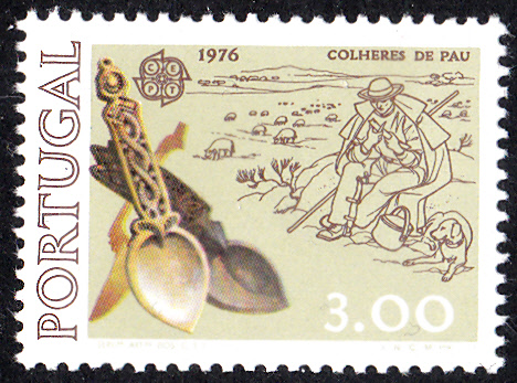 Die Europamarken 1976 zum Gemeinschaftsthema "Kunsthandwerk" erschienen in Portugal am 3. Mai 1976. Hier die Marke zu 3,00 Escudo mit der Abbildung eines holzgeschnitzten Zierlöffels und einem schnitzenden Schäfer. Die Marke ist in einer Auflage von 10 000 000 Stück erschienen.