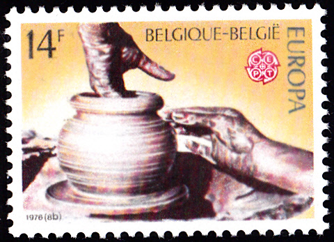 Die Europamarken 1976 zum Gemeinschaftsthema "Kunsthandwerk" erschienen in Belgien am 8. Mai 1976. Hier die Marke zu 14 Francs mit einer Abbildung zur Tontöpferei. Die Marke ist in einer Auflage von 3 000 000 Stück erschienen.