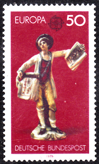 Die Europamarken 1976 zum Gemeinschaftsthema "Kunsthandwerk" erschienen bei der Deutschen Bundespost am 13. Mai 1976 mit Abbildungen von Erzeugnisse der Porzellanmanufaktur Ludwigsburg (um 1765). Hier die Marke zu 50 Pfennig mit der Abbildung einer Porzellanfigur "Straßenhändler mit Kupferstichen". Die Marke ist in einer Auflage von 98 650 000 Stück erschienen.
