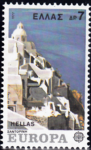 Die Europamarken 1977 zum Gemeinschaftsthema "Landschaften" erschienen in Griechenland am 16. Mai 1977. Hier die Marke zu 7 Drachmen. Abgebildet ist eine Ansicht von Fira, dem Hauptort auf der Insel Insel Santorin. Die Auflage betrug 4 200 000 Stück.