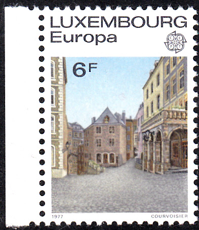 Die Europamarken 1977 zum Gemeinschaftsthema "Landschaften" erschienen in Luxemburg am 3. Mai 1977. Hier die Marke zu 6 Fr mit einer Abbildung aus der Altstadt von Luxemburg. Die Auflage betrug 1 000 000 Stück.