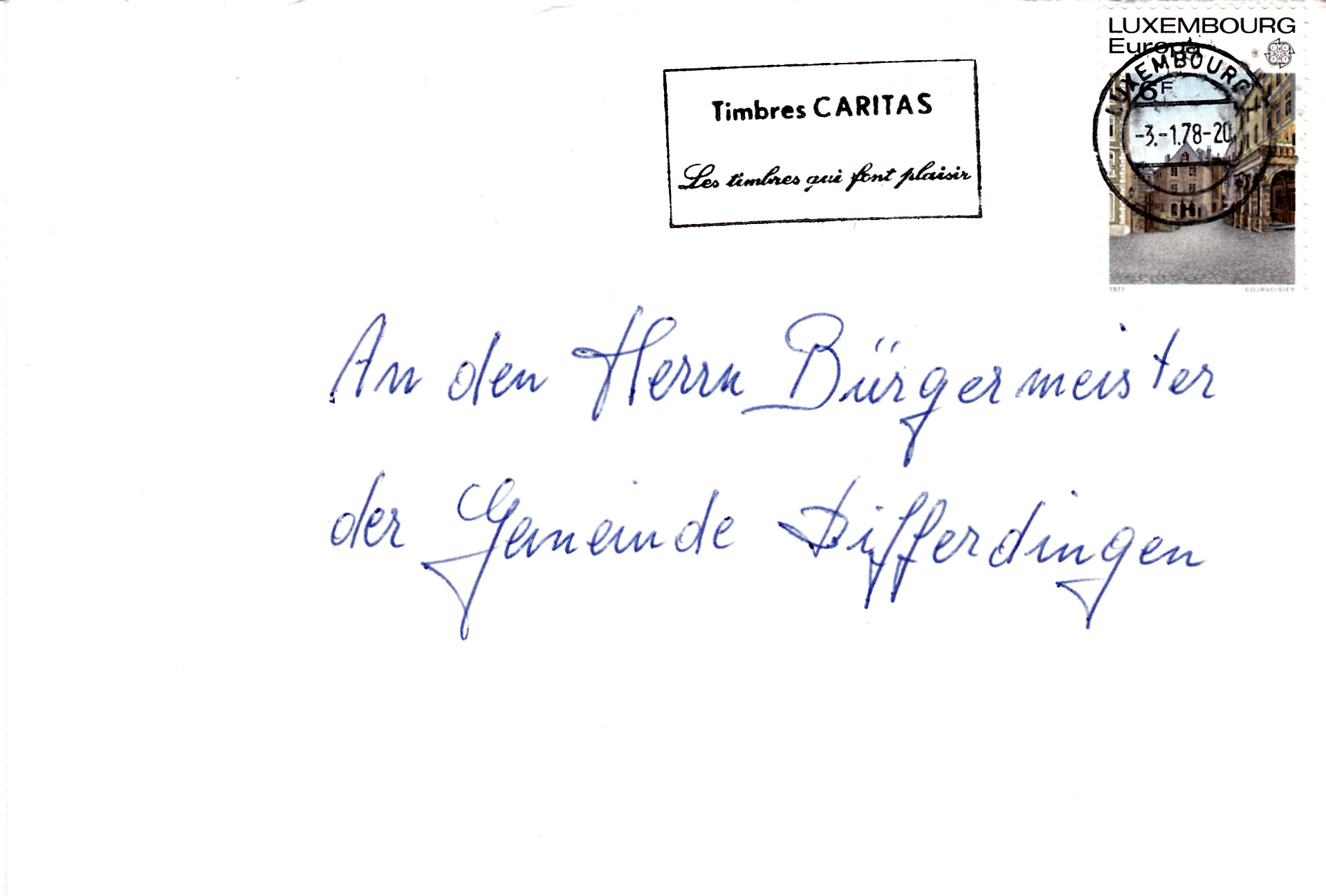 Einzelfrankatur mit der Europamarke 1977 zu 6 F aus Luxemburg auf einem Brief vom 3.1.1978 von Luxemburg nach Differdingen.