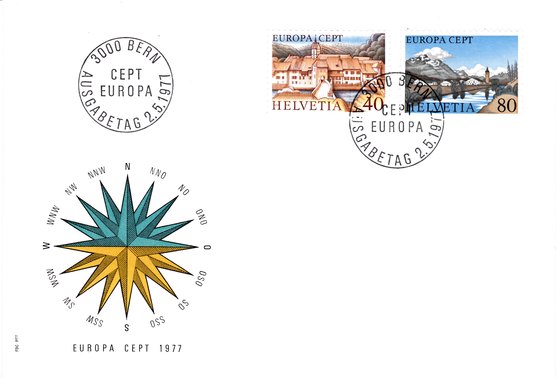 Die Europamarken 1977 zum Gemeinschaftsthema "Landschaften" erschienen in der Schweiz am 2. Mai 1977. Hier die Marke zu 40 Rappen mit einer Abbildung aus St.-Ursanne im Jura. Die Auflage betrug 29 397 000 Stück.
