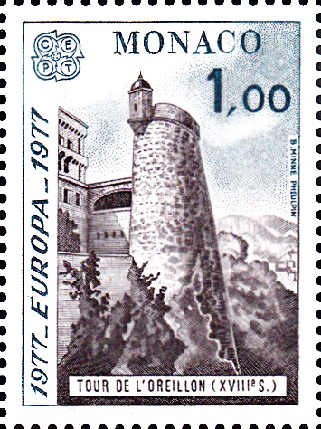 Die Europamarken 1977 zum Gemeinschaftsthema "Landschaften" erschienen in Monaco am 3. Mai 1977. Hier die Marke zu 1,00 F. Abgebildet wird der Oreillonturm in Monaco (18. Jh.) . Die Auflage betrug 779 527 Stück.