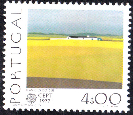 Die Europamarken 1977 zum Gemeinschaftsthema "Landschaften" erschienen in Portugal am 2. Mai 1977. Hier die Marke zu 4,00 Escudo. Abgebildet wird eine Südportugiesische Ebene. Die Auflage betrug 3 000 000 Stück. Die Marke ist auf Papier mit vorderseitigem Phosphorstreifen gedruckt.