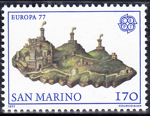 Die Europamarken 1977 zum Gemeinschaftsthema "Landschaften" erschienen in San Marino am 14. April 1977. Hier die Marke zu 170 Lire mit dem Monte Titano nach einem Detail eines Gemäldes von Domenico Ghirlandaio (1449-1494). Die Auflage betrug 900 000 Stück.
