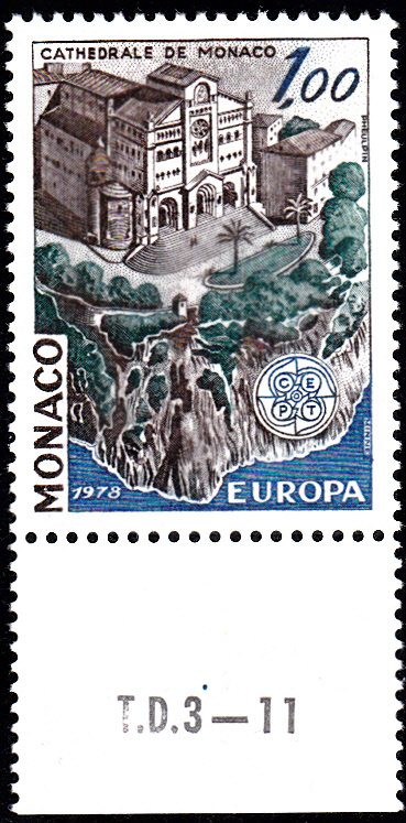 In Monaco erschienen die Europamarken 1978 zum Gemeinschaftsthema "Baudenkmäler" am 2. Mai 1978. Hier der Wert zu 1,00 Fr mit der Abbildung der Kathedrale von Monaco. Die Auflage betrug 670 877 Stück.