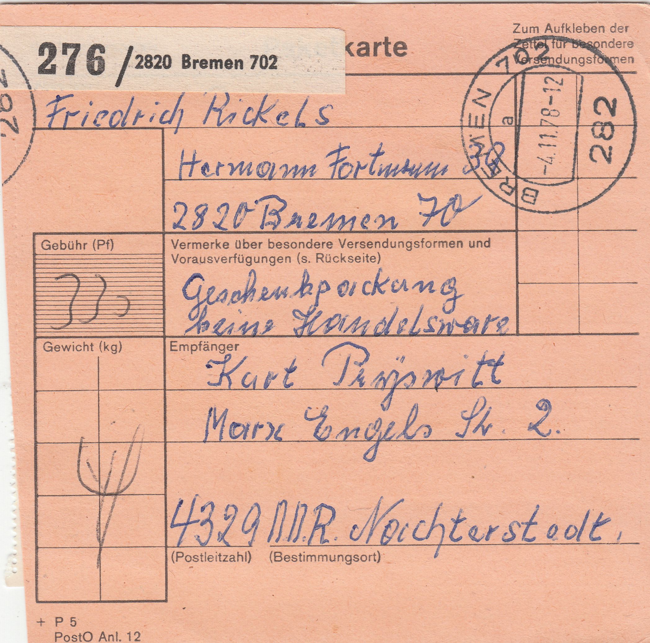Viererstreifen vom linken Bogenrand mit Bogenzählnummer "B 0 0 3 7 1 0" am 04.11.1978 in MiF auf einer Paketkarte: