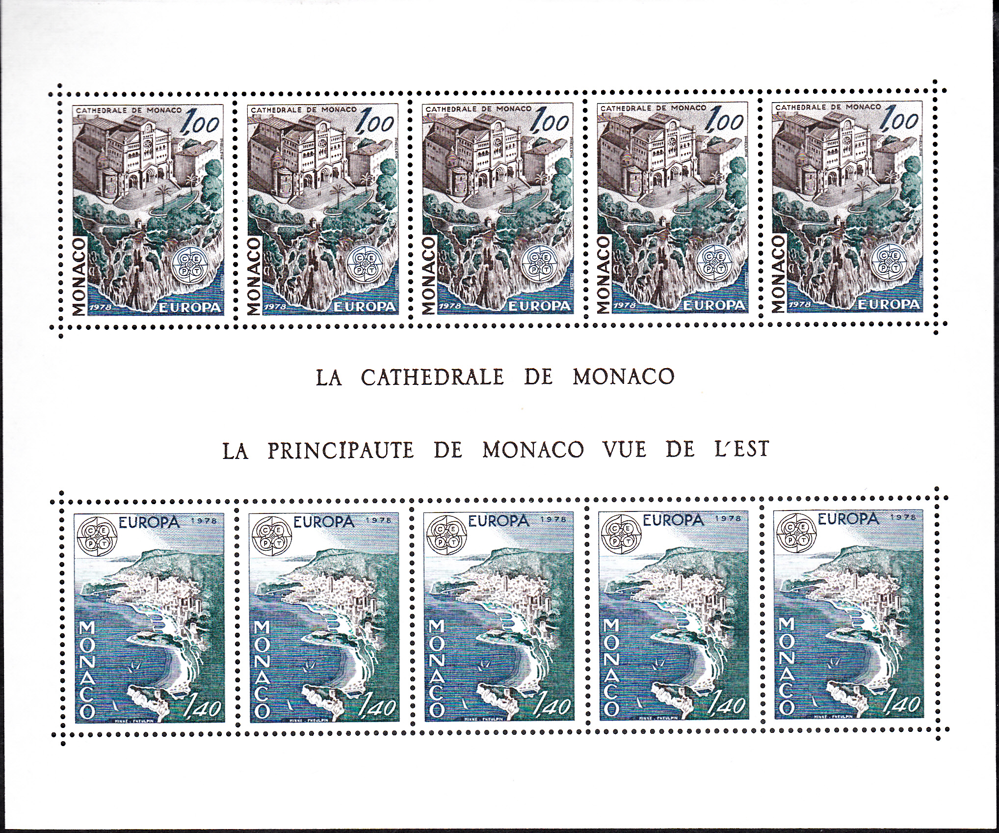 Die Europamarken 1978 zum Gemeinschaftsthema "Baudenkmäler" erschienen in Monaco am 2. Mai 1977. Neben den Einzelmarken erschien auch noch ein Block mit jeweils fünf Marken zu 1,00 Fr (MiNr 1319) und 1,40 Fr (MiNr 1320). Die Auflage betrug 275 111 Blocks.