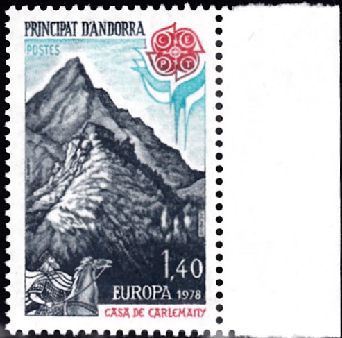 Bei der französischen Post in Andorra erschienen am 29. April 1978 die Europamarken 1978 zum Gemeinschaftsthema "Baudenkmäler". Hier die Marke zu 1,40 Fr mit einer Abbildung des Bergmassives "Haus Karls des Großen". Die Auflage betrug 500 000 Stück.