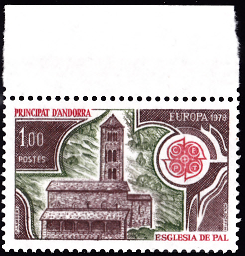Bei der französischen Post in Andorra erschienen am 29. April 1978 die Europamarken 1978 zum Gemeinschaftsthema "Baudenkmäler". Hier die Marke zu 1,00 Fr mit einer Abbildung der Kirche von Pal. Die Auflage betrug 800 000 Stück.