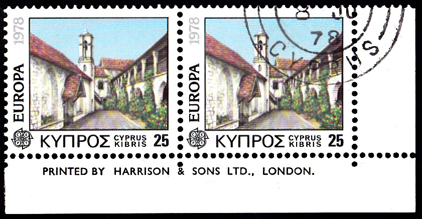 Auf Zypern erschienen die Europamarken 1978 zum Gemeinschaftsthema "Baudenkmäler" am 24. April 1978. Hier die Marke zu 25 Mills mit der Abbildung "Hof des Klosters Chrysorrhogiatissa " als waagerechtes Paar vom unteren rechten Bogenrand mit Druckvermerk. Hier hat ein Sammler die beiden Marken bei der Post erworben und eine der Marken direkt stempeln lassen.