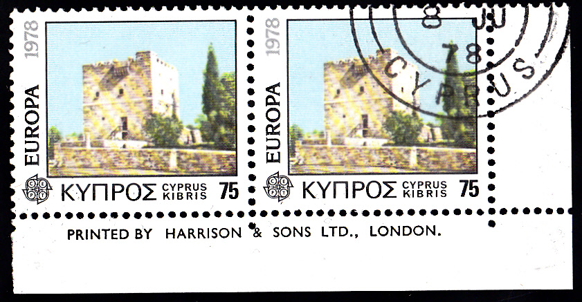 Auf Zypern erschienen die Europamarken 1978 zum Gemeinschaftsthema "Baudenkmäler" am 24. April 1978. Hier die Marke zu 75 Mills mit der Abbildung "Burg Kolossi" als waagerechtes Paar vom unteren rechten Bogenrand mit Druckvermerk. Hier hat ein Sammler die beiden Marken bei der Post erworben und eine der Marken direkt stempeln lassen.