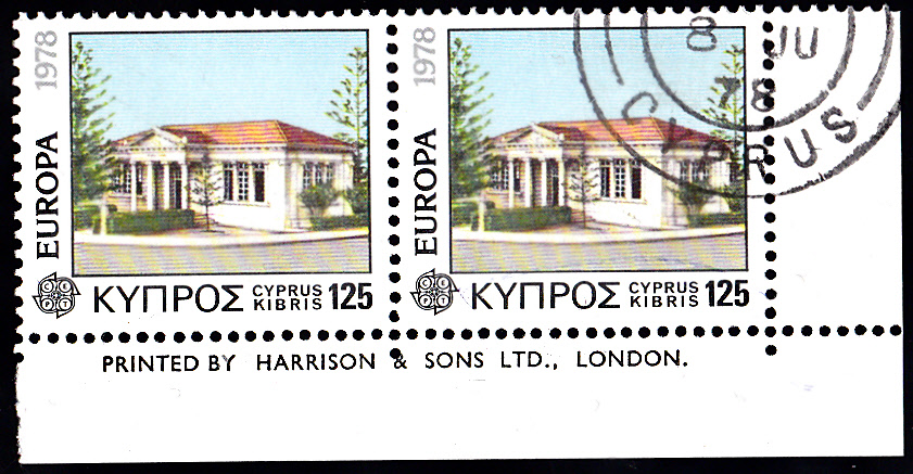 Auf Zypern erschienen die Europamarken 1978 zum Gemeinschaftsthema "Baudenkmäler" am 24. April 1978. Hier die Marke zu 125 Mills mit der Abbildung "Gemeindebücherei Paphos" als waagerechtes Paar vom unteren rechten Bogenrand mit Druckvermerk. Hier hat ein Sammler die beiden Marken bei der Post erworben und eine der Marken direkt stempeln lassen.