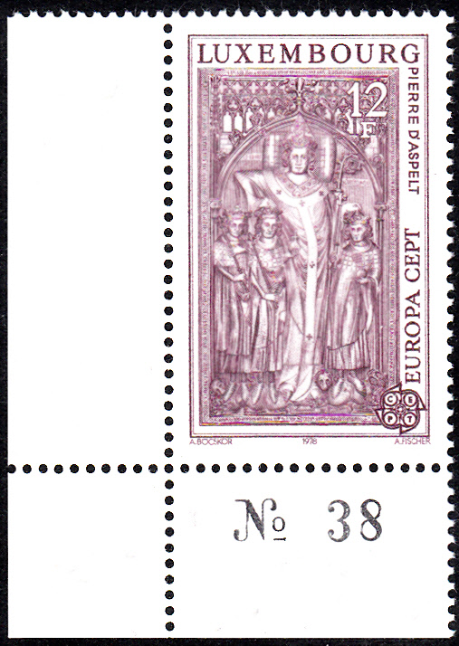 In Luxemburg erschienen die Europamarken 1978 zum Gemeinschaftsthema "Baudenkmäler" am 18. Mai 1978. Hier der Wert zu 12 Fr als Eckrandstück mit Bogenzählnummer mit der Abbildung des Grabmales von Peter von Aspelt (1250-1320, Bischof von Basel) im Mainzer Dom. Die Auflage betrug 800 000 Stück.