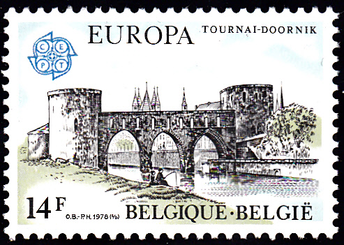 In Belgien erschienen am 6. Mai 1978 die Europamarken 1978 zum Gemeinschaftsthema "Baudenkmäler". Hier die Marke zu 14 Francs mit einer Abbildung "Pont des Trous in Tournai (Doornik)". Die Auflage betrug 3 000 000 Stück.