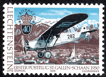 In Liechtenstein erschienen die Europamarken 1979 zum Gemeinschaftsthema "Geschichte des Post- und Fernmeldewesens" am 8. März 1979. Hier der Wert zu 40 Rappen mit der Abbildung "Postflugzeug AC-8 über Schaan".Die Auflage betrug 2 403 532 Stück.