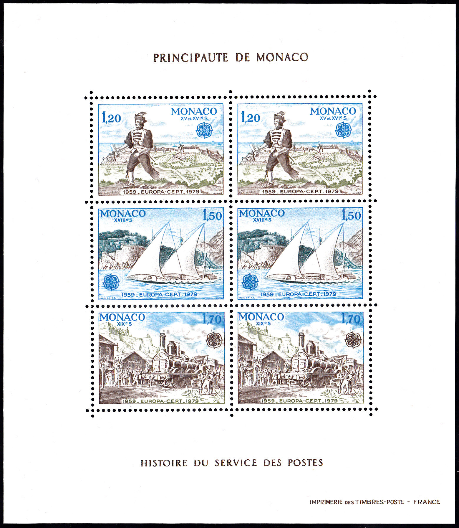 Die Europamarken 1979 zum Gemeinschaftsthema "Geschichte des Post- und Fernmeldewesens" erschienen in Monaco am 30. April 1979. Neben den Einzelmarken erschien auch noch ein Block mit jeweils zwei Marken zu 1,20 Fr (MiNr 1375), 1,50 Fr (MiNr 1376) und 1,70 Fr )MiNr 1377). Die Auflage betrug 311 960 Blocks.