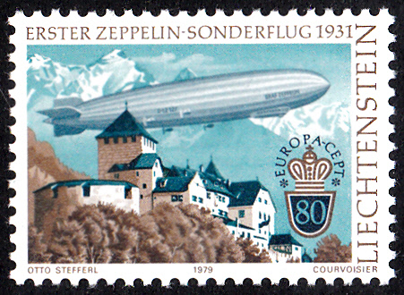 In Liechtenstein erschienen die Europamarken 1979 zum Gemeinschaftsthema "Geschichte des Post- und Fernmeldewesens" am 8. März 1979. Hier der Wert zu 80 Rappen mit der Abbildung "Luftschiff LZ 127 „Graf Zeppelin“ über Schloss Vaduz ". Die Auflage betrug 2 318 412 Stück.