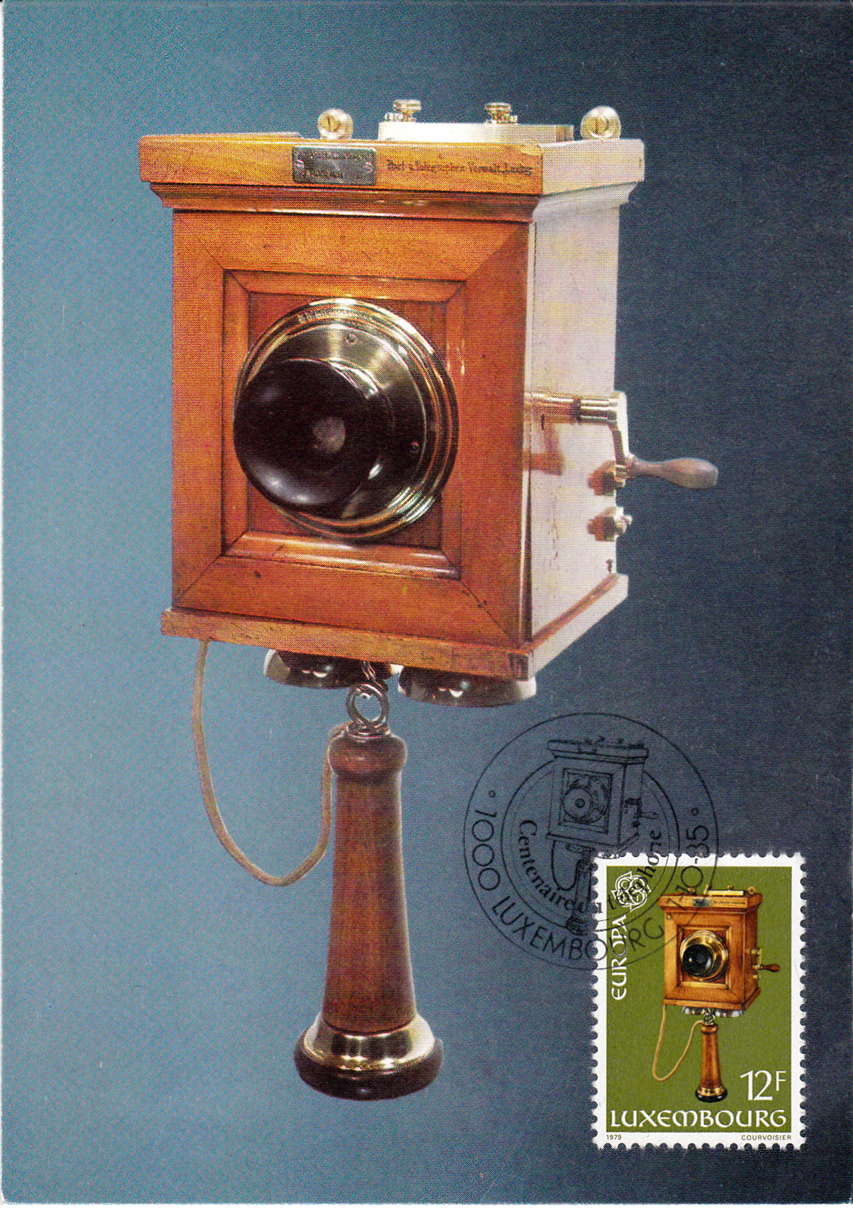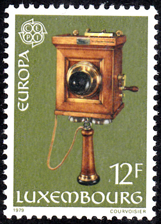 In Luxemburg erschienen die Europamarken 1979 zum Gemeinschaftsthema "Geschichte des Post- und Fernmeldewesens" am 30. April 1979. Hier die Marke zu 12 Fr mit der Abbildung eines Postkutsche Fernsprechwandapparates (um 1900). Die Auflage betrug 800 000 Stück.