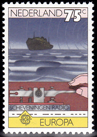 In den Niederlande erschienen die Europamarken 1979 zum Gemeinschaftsthema "Geschichte des Post- und Fernmeldewesens" am 2. Mai 1979. Hier die Marke zu 75 Cent mit der Abbildung eines Schiffes und einer Hand mit Morsetaste . Die Auflage betrug 12 423 200 Stück.