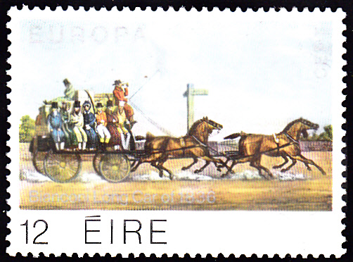 In Irland erschienen die Europamarken 1979 zum Gemeinschaftsthema "Geschichte des Post- und Fernmeldewesens" am 6. Dezember 1979. Hier die Marke zu 12 Pence mit der Abbildung einer Bianconi-Reisekutsche aus dem Jahre 1836. Die Auflage betrug 3 000 000 Stück.