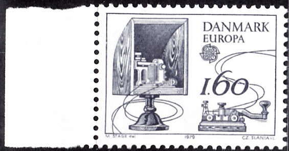 In Dänemark erschienen die Europamarken 1979 zum Gemeinschaftsthema "Geschichte des Post- und Fernmeldewesens" am 10. Mai 1979. Hier die Marke zu 1,60 Kronen schwarzblau mit der Abbildung eines Klopfertelegraphen. Die Auflage betrug 4 055 000 Stück.