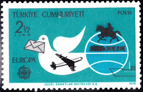 In der Türkei erschienen die Europamarken 1979 zum Gemeinschaftsthema "Geschichte des Post- und Fernmeldewesens" am 30. April 1979. Hier die Marke zu 2 1/2 Lira mit der Abbildung von Postbeförderungsmittel. Die Auflage betrug 600 000 Stück.