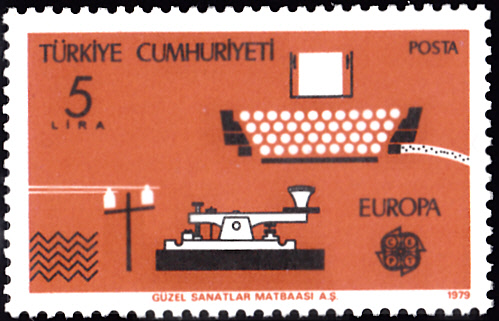 In der Türkei erschienen die Europamarken 1979 zum Gemeinschaftsthema "Geschichte des Post- und Fernmeldewesens" am 30. April 1979. Hier die Marke zu 5 Lira mit einem Morseapparat und einem Fernschreiber. Die Auflage betrug 600 000 Stück.