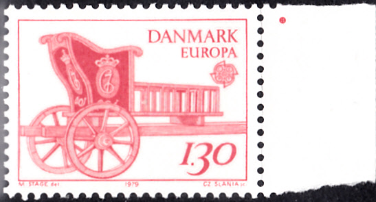 In Dänemark erschienen die Europamarken 1979 zum Gemeinschaftsthema "Geschichte des Post- und Fernmeldewesens" am 10. Mai 1979. Hier die Marke zu 1,30 Kronen schwarzblau mit der Abbildung einer Karriole. Die Auflage betrug 27 675 000 Stück.