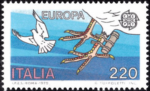 In Italien erschienen die Europamarken 1979 zum Gemeinschaftsthema "Geschichte des Post- und Fernmeldewesens" am 30. April 1979. Hier die Marke zu 220 Lire mit der Abbildung von Brieftauben. Die Auflage betrug 10 000 000 Stück.