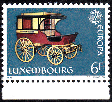In Luxemburg erschienen die Europamarken 1979 zum Gemeinschaftsthema "Geschichte des Post- und Fernmeldewesens" am 30. April 1979. Hier die Marke zu 6 Fr mit der Abbildung einer Postkutsche (19. Jh.). Die Auflage betrug 800 000 Stück.