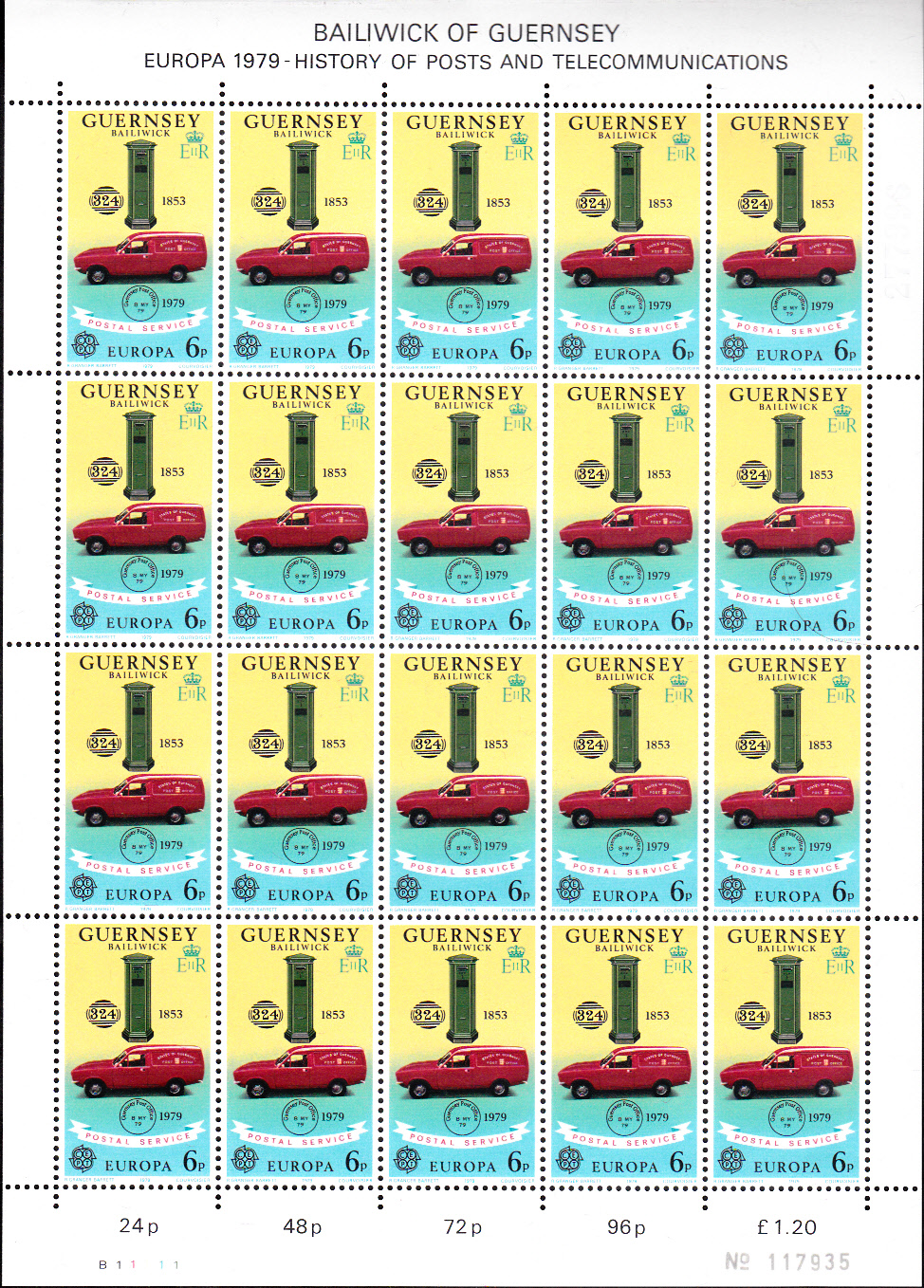 Auf Guernsey erschienen die Europamarken 1979 zum Gemeinschaftsthema "Geschichte des Post- und Fernmeldewesens" am 8. Mai 1979. Hier der Wert zu 6 Pence mit eine Abbildung eines Briefkasten und einem Stempel aus dem Jahre 1853 und eines Postautos und einem Stempel aus dem Jahre 1979. Die Auflage betrug 1 863 564 Stück.