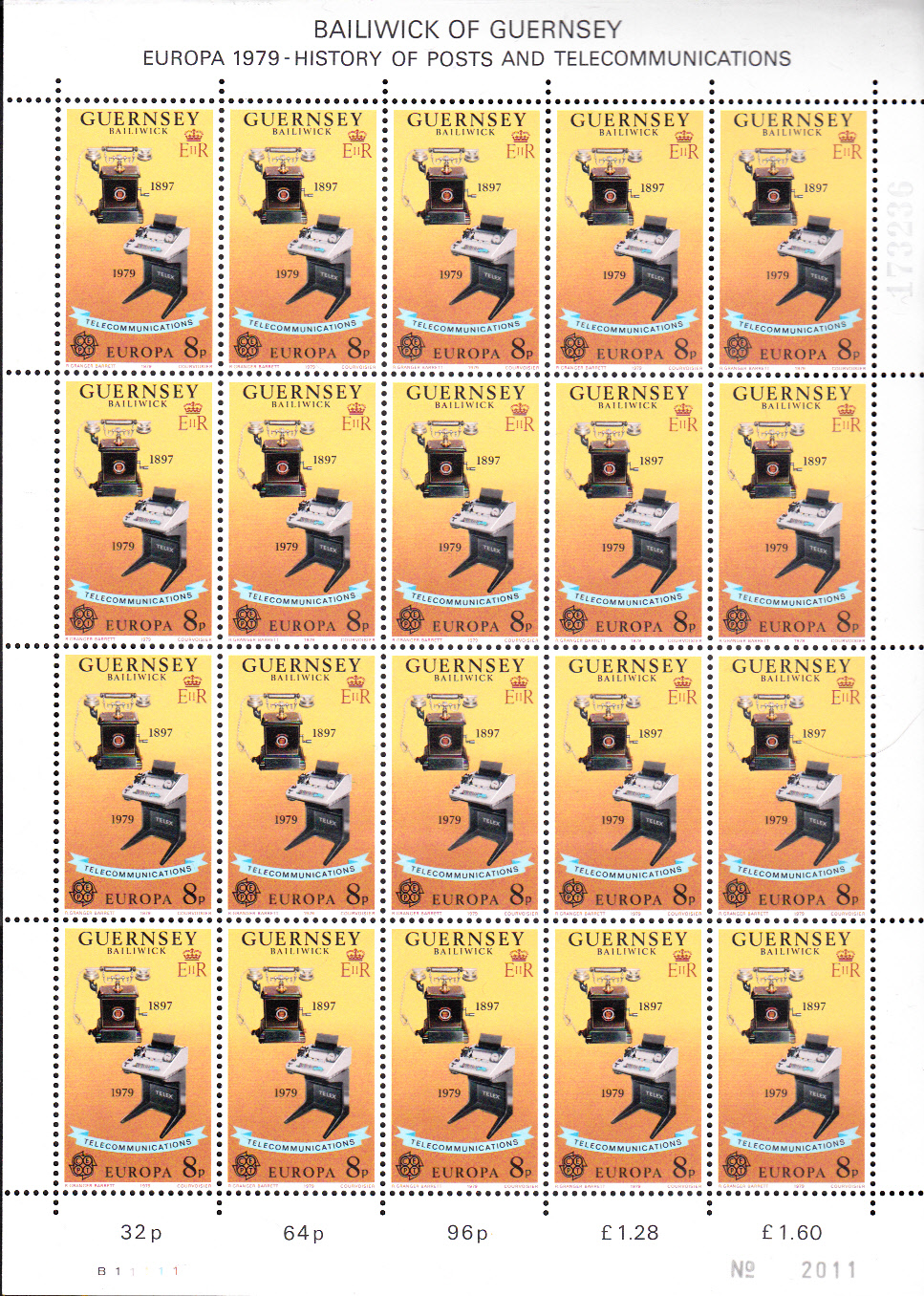 Auf Guernsey erschienen die Europamarken 1979 zum Gemeinschaftsthema "Geschichte des Post- und Fernmeldewesens" am 8. Mai 1979. Hier der Wert zu 6 Pence mit eine Abbildung eines Telefonapparates (1897) und eines Fernschreibers (1979). Die Auflage betrug 2 293 379 Stück.