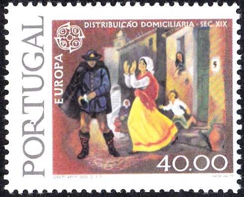 In Portugal erschienen die Europamarken 1979 zum Gemeinschaftsthema "Geschichte des Post- und Fernmeldewesens" am 30. April 1979. Hier die Marke zu 40,00 Escudo mit der Abbildung Postbote überbringt die Post (19. Jh.). Die Marke gibt es auf normalem Papier (x) und auf Papier mit vorderseitigem Phosphorstreifen (y). Die Auflage betrug für MiNr. 1442 x = 1 000 000 Stück und für MiNr 1441 y = 100 000 Stück.