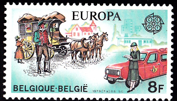 In Belgien erschienen die Europamarken 1979 zum Gemeinschaftsthema "Geschichte des Post- und Fernmeldewesens" am 28. April 1979. Hier die Marke zu 8 Francs mit der Abbildung einer Postkutsche und eines Postautos. Die Auflage betrug 10 000 000 Stück.