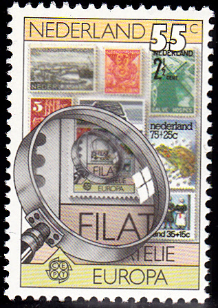 In den Niederlande erschienen die Europamarken 1979 zum Gemeinschaftsthema "Geschichte des Post- und Fernmeldewesens" am 2. Mai 1979. Hier die Marke zu 55 Cent mit der Abbildung von Briefmarken und einer Lupe (Philatelie). Die Auflage betrug 12 423 200 Stück.