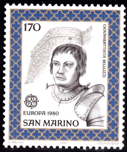 In San Marino erschienen die Europamarken 1980 zum Gemeinschaftsthema "Bedeutende Persönlichkeiten" am 8. Mai 1980. Hier die Marke zu 170 Lire mit einem Porträt von Giovanbattista Belluzzi (1506-1554, Militärarchitekt) und dem Wallwerk von San Marino. Die Auflage der Marke betrug 750 000 Stück.