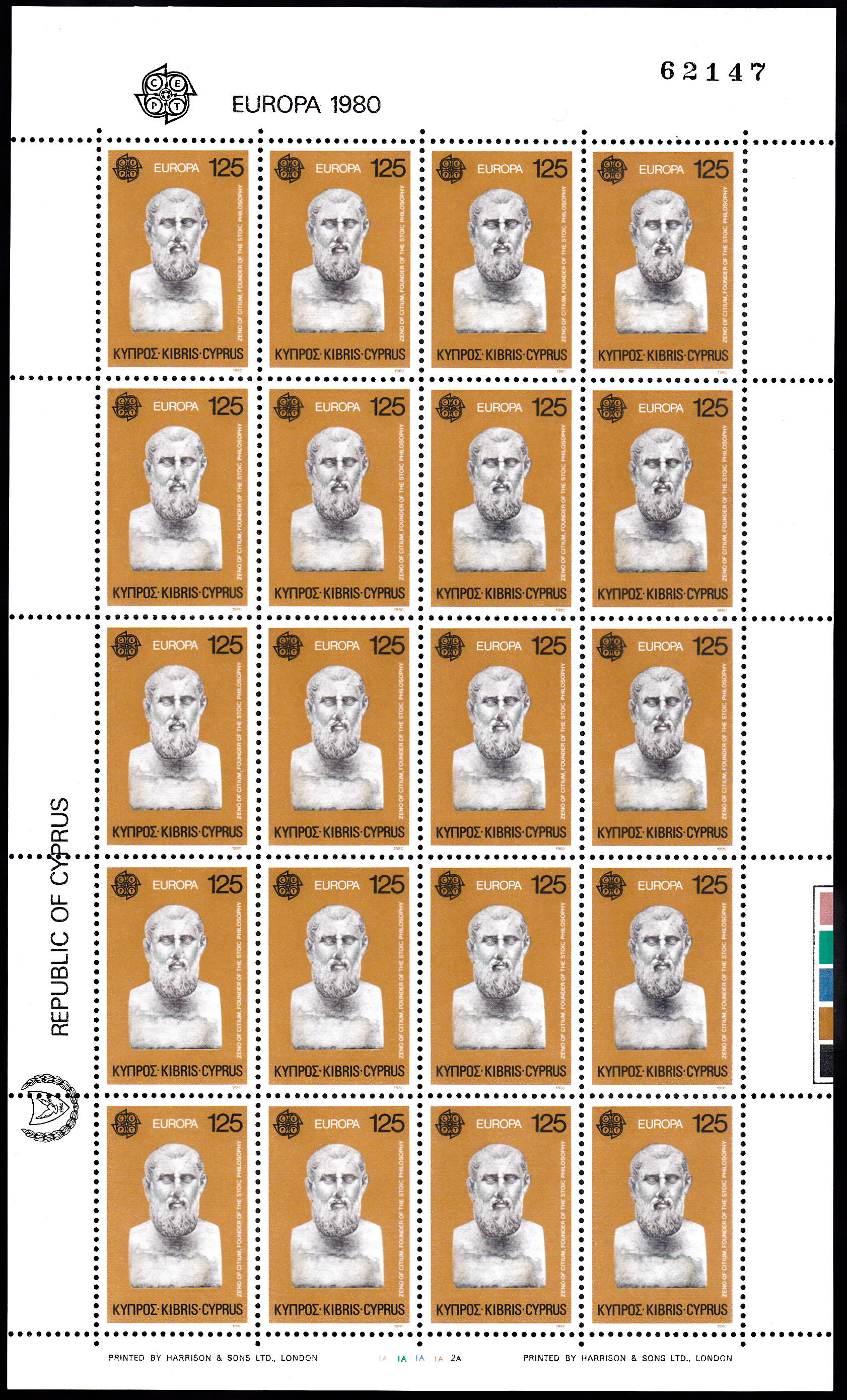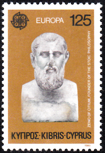 Auf Zypern erschienen die Europamarken 1980 zum Gemeinschaftsthema "Bedeutende Persönlichkeiten" am 28. April 1980. Hier die Marke zu 125 Mills mit der Abbildung einer Büste von Zenon von Kition (354-262 v. Chr.) dem Gründer der Stoischen Philosophenschule.
