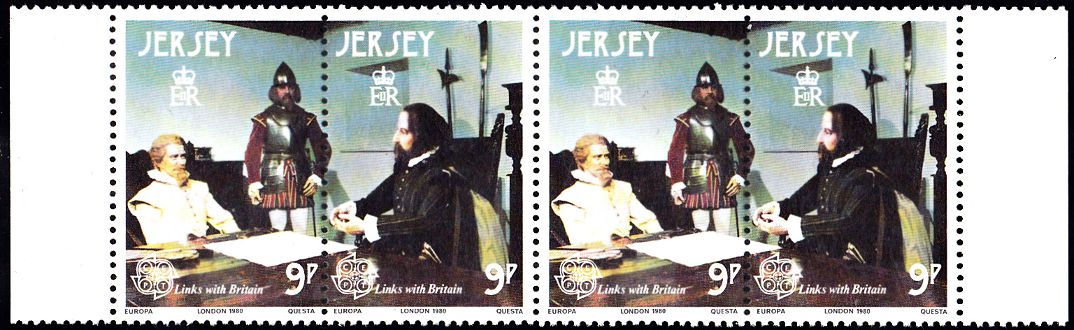 Auf Jersey erschienen die Europamarken 1980 zum Gemeinschaftsthema "Bedeutende Persönlichkeiten" am 6. Mai 1980. Hier je zweimal die beiden Marke zu 9 Pence die waagerecht zusammenhängend gedruckt wurden mit der Abbildung von Gouverneur Walter Raleigh und Militär-Ingenieur Paul Ivy. Die Auflage dieser Marken betrug zusammen 4 793 980 Stück.