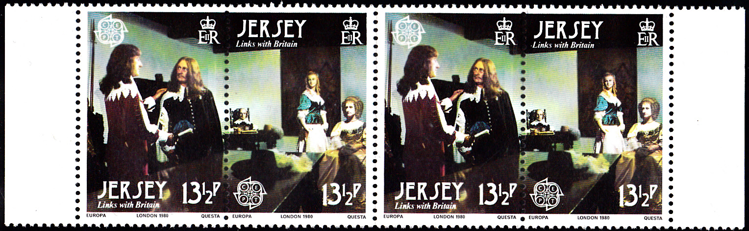 Auf Jersey erschienen die Europamarken 1980 zum Gemeinschaftsthema "Bedeutende Persönlichkeiten" am 6. Mai 1980. Hier je zweimal die beiden Marke zu 13 1/2 Pence die waagerecht zusammenhängend gedruckt wurden mit der Abbildung von König Charles II. und Gouverneur George Carteret. Die Auflage dieser Marken betrug zusammen 2 638 136 Stück.