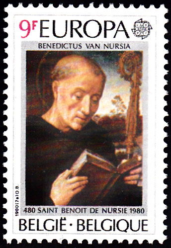 In Belgien erschienen die Europamarken 1980 zum Gemeinschaftsthema "Bedeutende Persönlichkeiten" am 26. April 1980. Hier die Marke zu 9 Francs mit der Abbildung des Hl. Benedikt von Nursia (480-547, Ordensgründer). Die Auflage betrug 10 000 000 Stück.